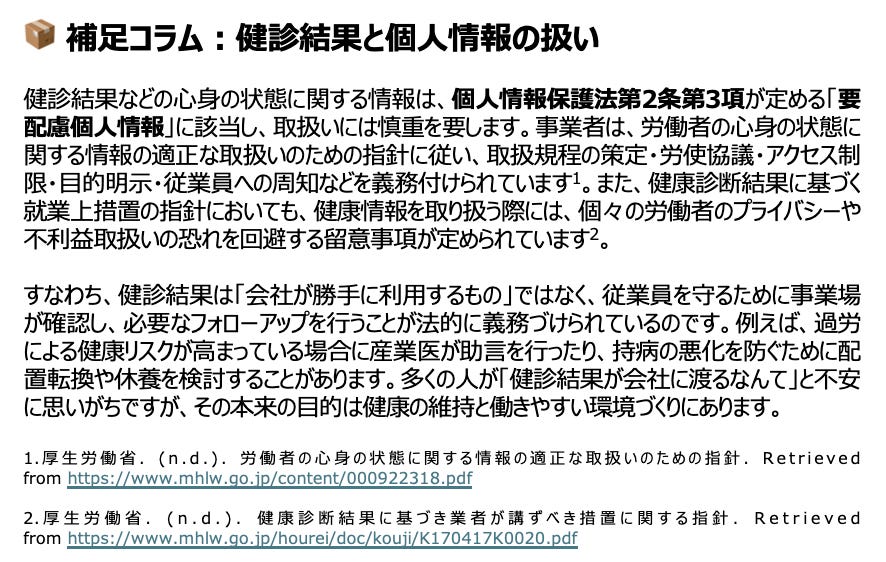 日本の職域健診制度は、1911年の工場法に端を発し4、1947年の労働基準法で労働条件の基本原則が定まり5、1972年の労働安全衛生法とその下位法で事業者に年1回の定期健康診断の実施が義務化されてきました6。